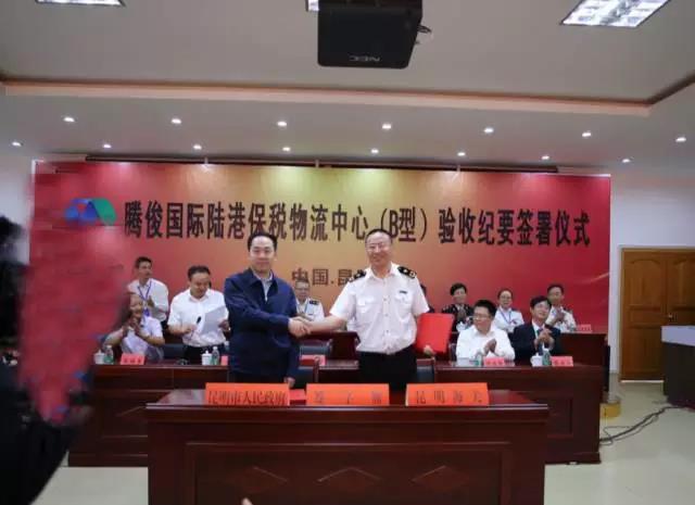 昆明海關(guān)副關(guān)長馬軍與昆明市人民政府副市長洪維智簽署了《騰俊國際陸港保稅物流中心基礎(chǔ)和監(jiān)管設(shè)施驗收紀要》。昆明市人民政府高庚副秘書長、晉寧區(qū)人民政府李福軍區(qū)長、昆明市商務(wù)和投資促進局徐增雄局長、及省、市、區(qū)各級有關(guān)部門負責(zé)人參加了驗收工作。